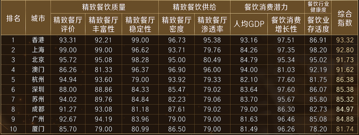 头部城市凸显区位禀赋:港澳依托国际贸易自由港及旅游目的地的地位,在精致餐厅稳定性(99.00分/96.37分)和精致餐厅密度(96.73分/96.90分)上建立核心优势,港澳两地米其林餐厅数量占10个观察城市总量的31%,印证了它们在亚太高端餐饮市场的统治地位。上海、北京凭借超大城市能级,在精致餐厅评价(99.00分/95.72分)与精致餐厅丰富性(99.00分/95.08分)上展现统治力。内地新锐呈现差异化短板——杭州餐饮消费增长性(77.60分)拖累其高端供给优势(精致餐厅密度93.92分);深圳虽餐饮消费增长性冠绝榜单(97.60分),但精致餐厅稳定性(84.33分)制约排名。值得注意的是,成都在餐饮业存活度(82.73分)及人均GDP(79.00 分)指标承压,反映内陆市场差异很大。